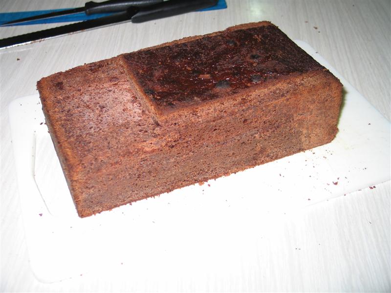 The built-up roof needed a little smoothing, so I came up with the idea of mixing some cake crumbs from the off-cuts with a little ganache to make a sort of "chocolate putty" to spread over it.